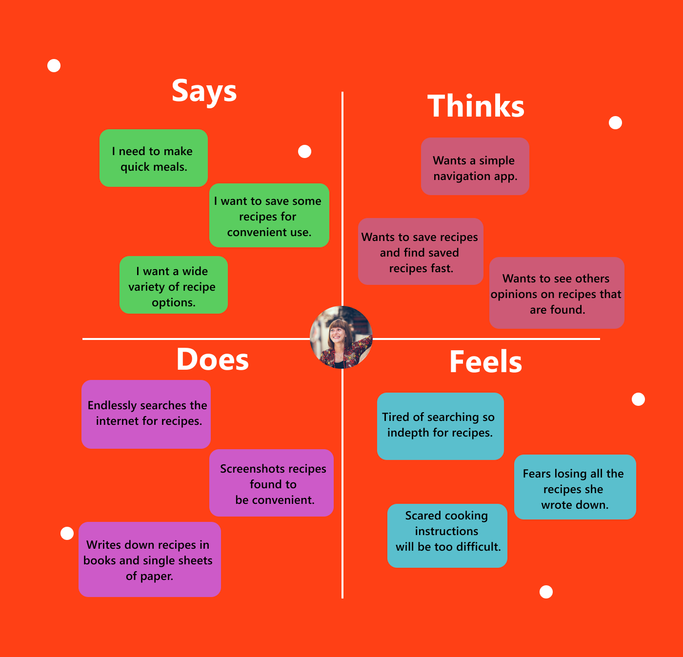 I created an empathy map to document high-level behaviors, goals, frustrations, and influences. I channeled this into a persona – a document to guide solutions.