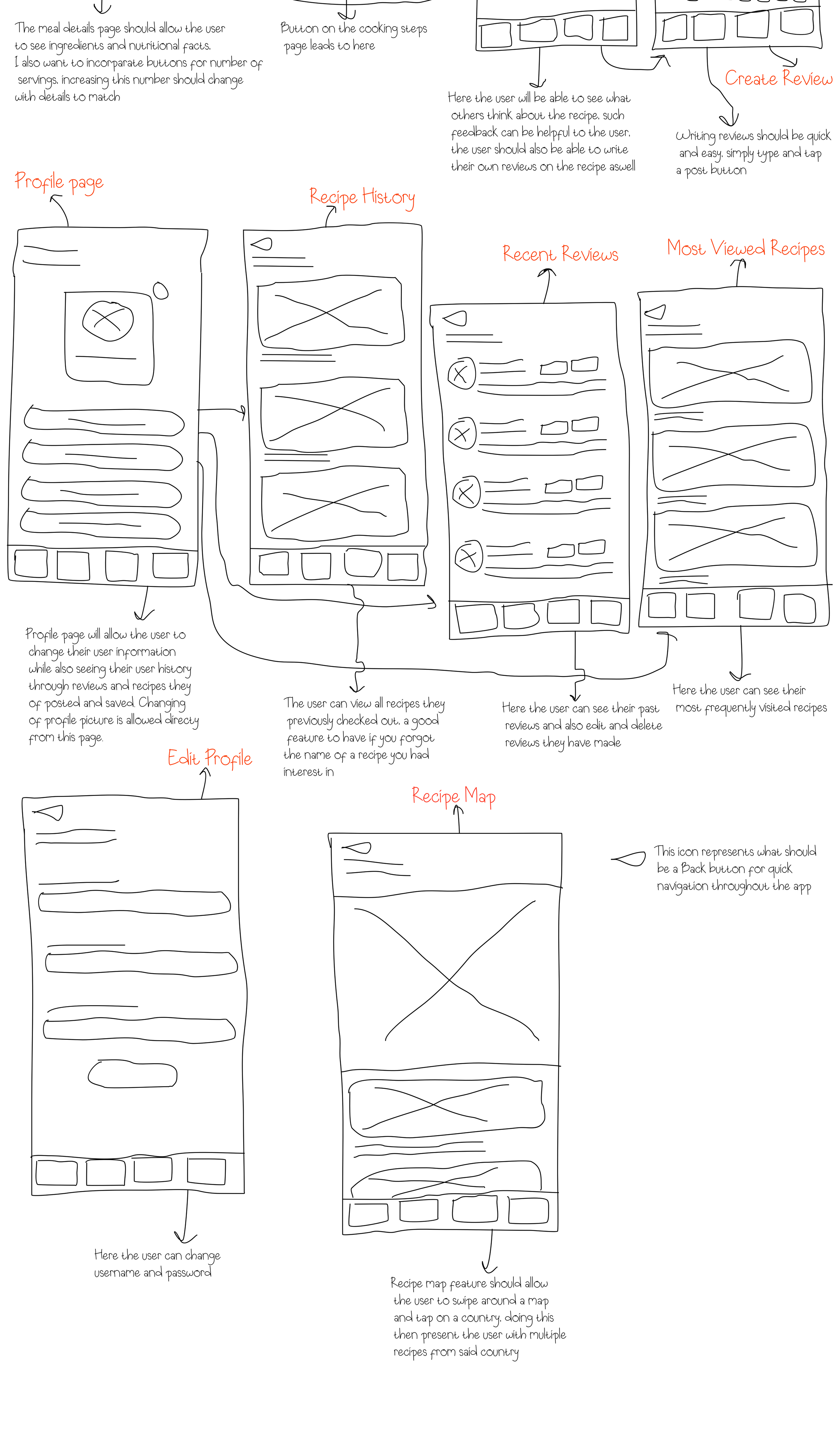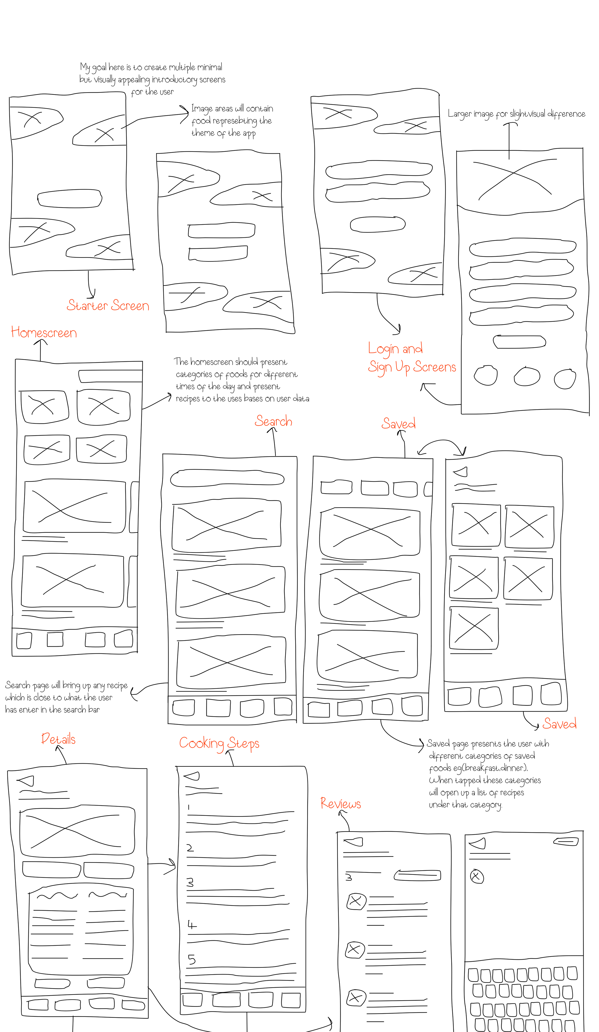 At this point I began to sketch the user flow in the form of the app. After I tested out multiple ways to move through the application – login, sign up, viewing different recipes, moving from home to other screens seamlessly, checking recipe steps and more, I decided to settle with the final sketches presented below.