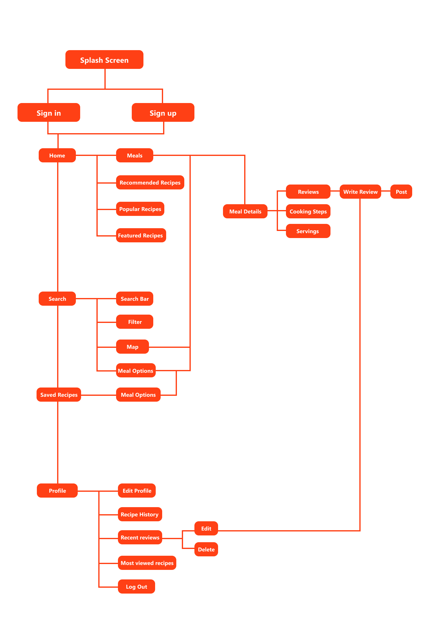 I started mapping out the Munch’in experience through flows. I wanted to visualize a seamless movement throughout the app. Entering the app, getting to the home screen to view different recipe categories , saving your favorite recipes , seeing cooking instructions, adding reviews and seeing other user reviews, among others.