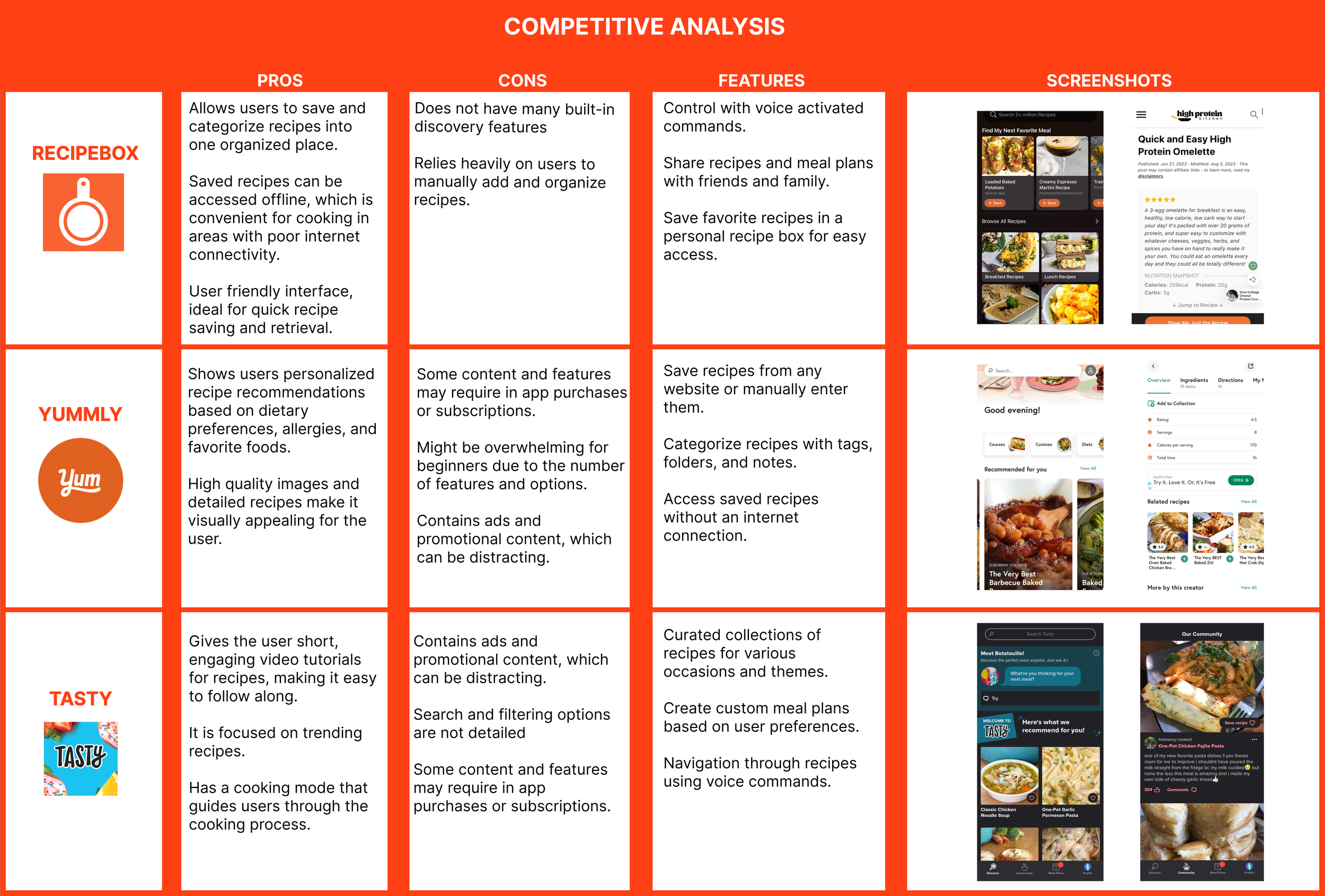 For my competitive analysis, I decided to focus on these three apps: Tasty, Yummly and Recipe box. While doing my analysis, I found some issues that were similar between each apps and also individual problems.